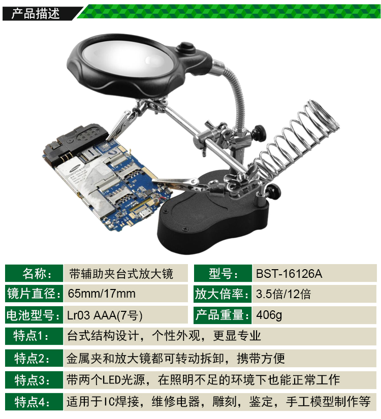 返回當前位置: 首頁 / 產品中心 / BST-16126A 帶輔助夾臺式放大鏡 焊接放大鏡