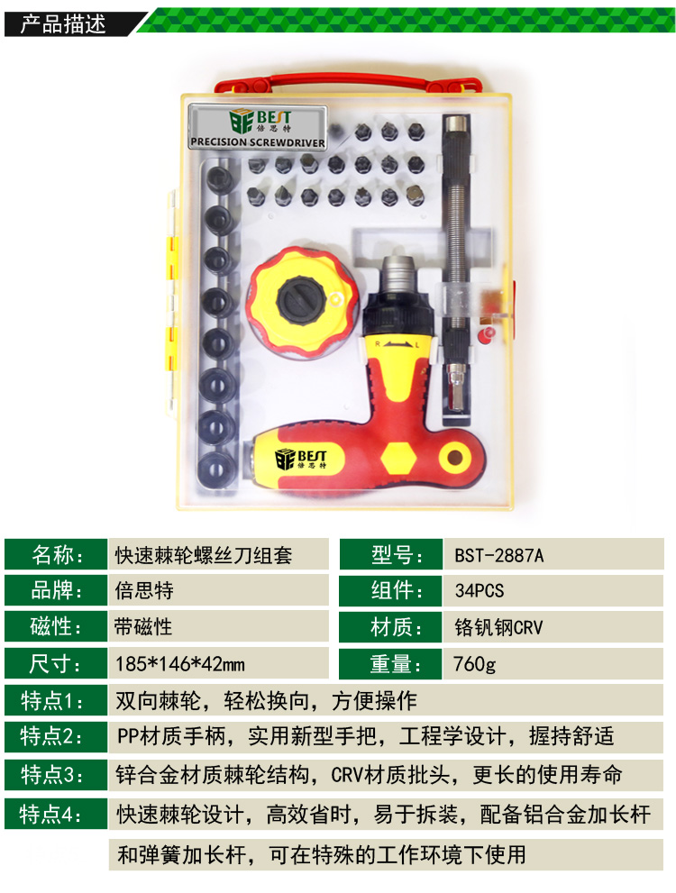 返回當(dāng)前位置: 首頁 / 產(chǎn)品中心 / BST-2887A 34件套 快速棘輪螺絲刀組套