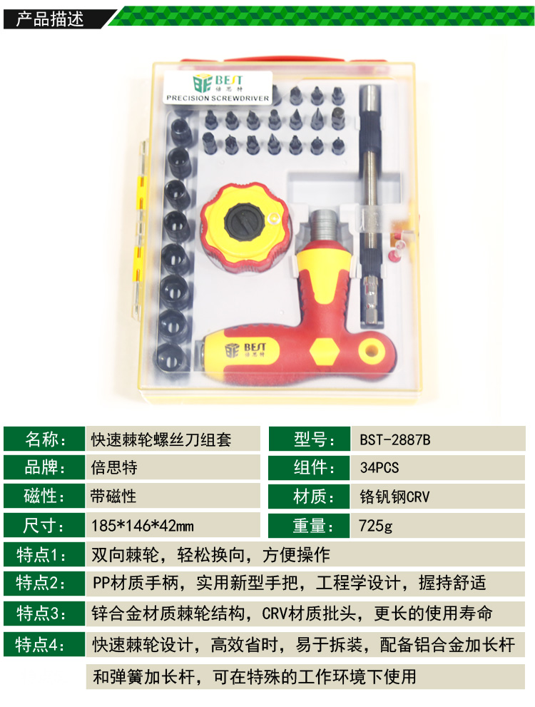 返回當(dāng)前位置: 首頁 / 產(chǎn)品中心 / BST-2887B 34件套 快速棘輪螺絲刀組套