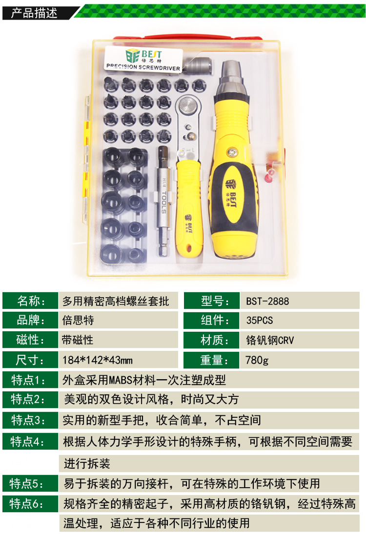 返回當(dāng)前位置: 首頁(yè) / 產(chǎn)品中心 / BST-2888 35件套 多用精密高檔螺絲起子套裝