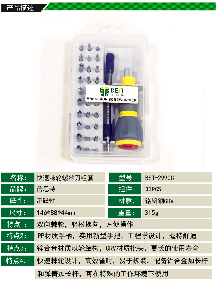 返回當(dāng)前位置: 首頁 / 產(chǎn)品中心 / BST-2990C 33件套 快速棘輪螺絲刀組套