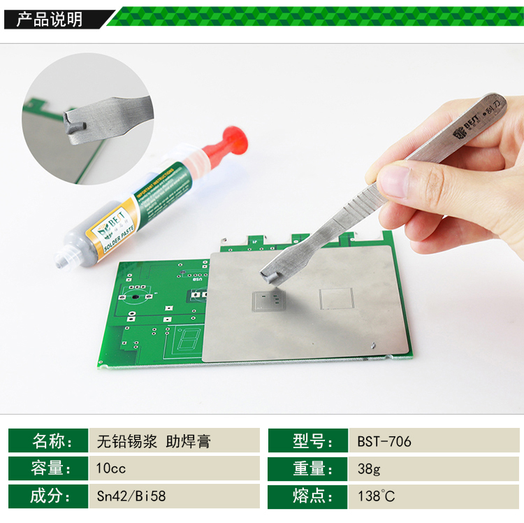 返回當(dāng)前位置: 首頁(yè) / 產(chǎn)品中心 / BST-706 針筒式無(wú)鉛錫漿 低溫?zé)o鉛錫膏 焊錫膏 Sn42/Bi58 10cc